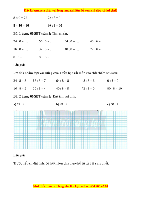 Bài 2 trang 66 SBT toán 3: Đ t ặ tính rồi tính. a) 57 : 8 b) 89 : 8 c) 70 : 8 L i ờ giải Trư c h ớ t ế em đ t ặ tính rồi th c hi ự n chi ệ a theo th t ứ t ự t ừ rái sang ph i ả . Mọi th c ắ m c