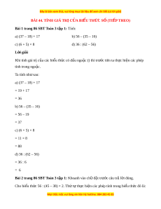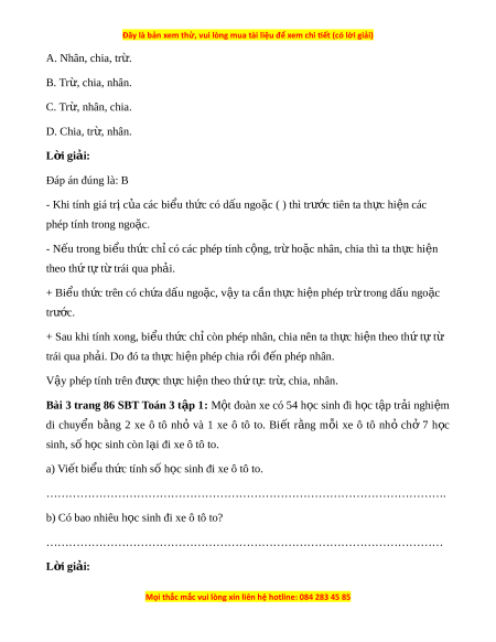 A. Nhân, chia, tr . ừ B. Tr , chi ừ a, nhân. C. Tr , nhân, chi ừ a. D. Chia, tr , ừ nhân. L i ờ giải: Đáp án đúng là: B - Khi tính giá tr c ị a ủ các bi u t ể h c có ứ d u ngo ấ c ặ ( ) thì trư c t ớ iên ta th c hi ự n các ệ phép tính trong ngo c. ặ - N u t ế rong bi u t ể h c ch ứ có các ỉ phép tính c ng, t ộ rừ ho c nhân, chi ặ a thì ta th c hi ự n ệ theo th t ứ ự t t ừ rái qua ph i ả . + Bi u ể th c t ứ rên có ch a d ứ u ngo ấ c, ặ v y t ậ a c n t ầ h c hi ự n phép t ệ r t ừ rong d u ngo ấ c ặ trư c. ớ + Sau khi tính xong, bi u t ể h c ch ứ còn phép ỉ nhân, chia nên ta th c hi ự n t ệ heo th t ứ t ự ừ trái qua ph i ả . Do đó ta th c hi ự n phép chi ệ a r i ồ đ n ế phép nhân. V y ậ phép tính trên đư c t ợ h c hi ự n t ệ heo th t ứ : ự tr , chi ừ a, nhân.
