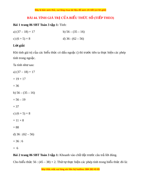 Bài 1 trang 86 SBT Toán 3 t p 1: ậ Tính: a) (37 – 18) + 17 b) 56 – (35 – 16) c) (6 + 5) × 8 d) 36 : (62 – 56) L i ờ giải Khi tính giá tr c ị a ủ các bi u ể th c ứ có d u ngo ấ c ( ặ ) thì trư c t ớ iên ta th c ự hi n các phép ệ tính trong ngo c. ặ Ta tính nh s ư au: a) (37 – 18) + 17 = 19 + 17 = 36 b) 56 – (35 – 16) = 56 – 19 = 37 c) (6 + 5) × 8 = 11 × 8 = 88 d) 36 : (62 – 56) = 36 : 6 = 6