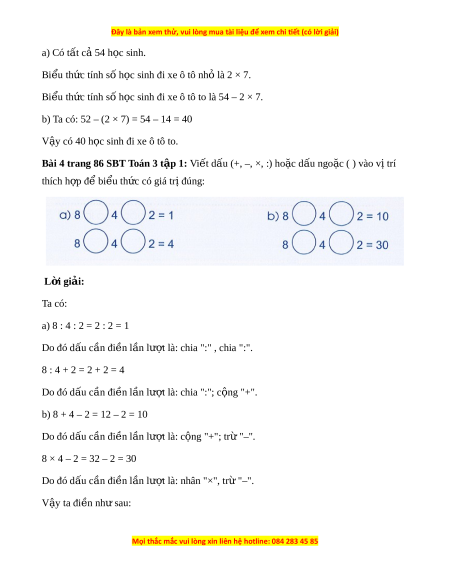Bài 4 trang 86 SBT Toán 3 t p 1ậ : Vi t d u (+, –, ×, :) ho c d u ngo c (ế ấ ặ ấ ặ ) vào v trí ị