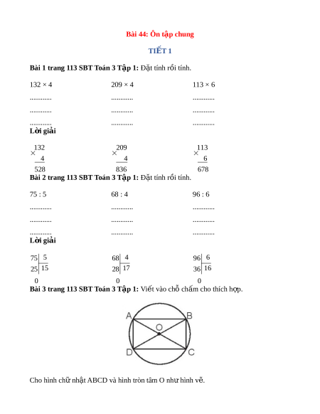 Bài 1 trang 113 SBT Toán 3 T p 1: ậ Đ t ặ tính r i ồ tính. 132 × 4 209 × 4 113 × 6 ............ ............ ............ ............ ............ ............ ............ ............ ............ L i ờ giải 132 209 113 4 4 6 528 836 678