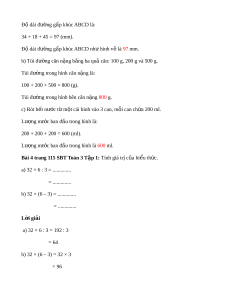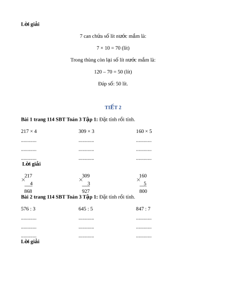 Bài 5 trang 114 SBT Toán 3 T p ậ 1: C a ử hàng có m t ộ thùng đ ng ự 120 l nư c ớ m m ắ . Cửa hàng đã l y ấ ra 7 can, m i ỗ can 10 l nư c ớ m m ắ . H i ỏ trong thùng còn l i ạ bao nhiêu lít nư c ớ m m ắ ? L i ờ giải 7 can ch a s ứ ố lít nư c ớ m m ắ là: 7 × 10 = 70 (lít) Trong thùng còn l i ạ số lít nư c m ớ m ắ là: 120 – 70 = 50 (lít) Đáp số: 50 lít. TI T Ế 2