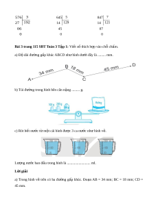 Bài 3 trang 115 SBT Toán 3 T p 1: ậ Vi t ế số thích h p vào ch ợ ch ỗ m ấ . a) Đ dài ộ đư ng ờ g p khúc ấ ABCD nh hì ư nh dư i ớ đây là ......... mm. b) Túi đư ng t ờ rong hình bên cân n ng ặ ......... g. c) Rót h t ế nư c ớ t m ừ t ộ cái bình đư c ợ 3 ca nư c ớ nh hì ư nh v . ẽ Lư ng n ợ ư c ớ ban đ u t