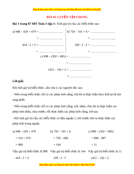 Bài 3 trang 88 SBT Toán 3 t p 1 ậ : a) Tính giá tr c ị a ủ các bi u t ể h c ứ sau: