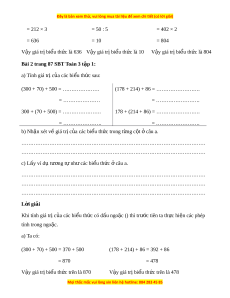 …………………………………………………………………………………………… L i ờ giải Khi tính giá tr c ị a ủ các bi u ể th c ứ có d u ngo ấ c ( ặ ) thì trư c t ớ iên ta th c ự hi n các phép ệ tính trong ngo c. ặ a) Ta có: (300 + 70) + 500 = 370 + 500 (178 + 214) + 86 = 392 + 86 = 870 = 478 V y ậ giá tr bi ị u t ể h c ứ trên là 870 V y gi ậ á tr bi ị u t ể h c t ứ rên là 478