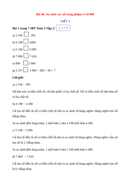 Bài 1 trang 7 SBT Toán 3 T p 2 ậ : >, < = ? a) 2 194 395 b) 4 198 4200 c) 5 100 5 099 d) 7 000 7 010 e) 899 1 000 g) 3 257 3 000 + 200 + 50 + 7 L i ờ giải a) 2 194 > 395 Số bên trái có b n ố chữ s , ố số bên ph i ả có ba ch ữ s . ố S ố có b n ố ch ữ s ố l n ớ h n ơ số có ba ch s ữ ố. b) 4 198 < 4 200 Cả hai số đ u ề là số có b n ố ch ữ s ố nên ta so sánh t