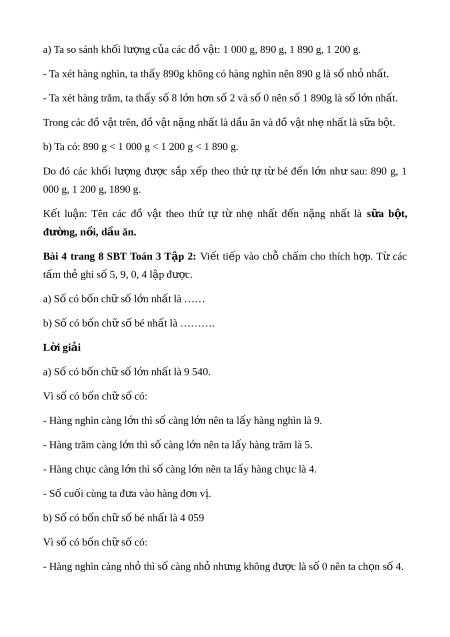 Bài 3 trang 7, 8 SBT Toán 3 T p ậ 2: Vi t ế ti p ế vào chỗ ch m ấ cho thích h p. ợ Cho các đồ v t ậ v i ớ cân n ng ặ nh s ư au: a) Trong các đồ v t ậ trên, đ v ồ t ậ n ng ặ nh t