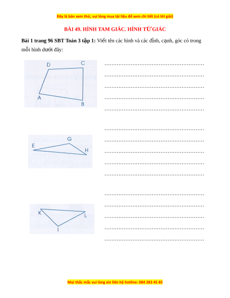 VBT Toán lớp 3 Bài 49 (Cánh diều): Hình tam giác. Hình tứ giác