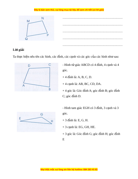 ện nêu tên các hình, các đ nh, các ỉ c nh và các ạ góc c a ủ các hình nh s ư au: - Hình t gi ứ ác ABCD có 4 đ nh, 4 c ỉ nh ạ và 4 góc. + 4 đ nh l ỉ à: A, B, C, D. + 4 c nh l ạ à: AB, BC, CD, DA. + 4 góc là: Góc đ nh ỉ A; góc đ nh B ỉ ; góc đ nh ỉ C; góc đỉnh D.