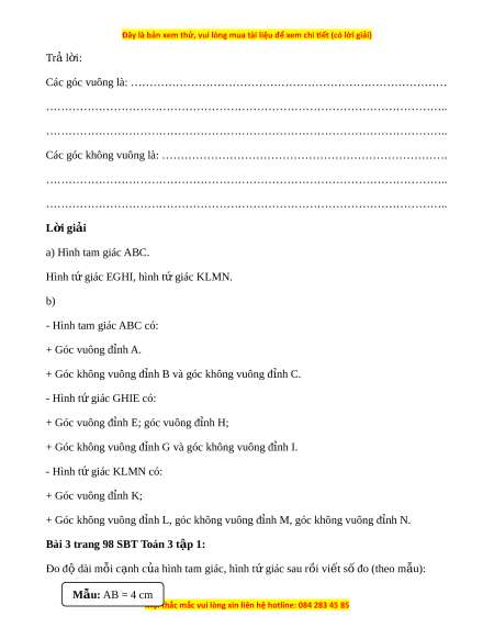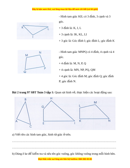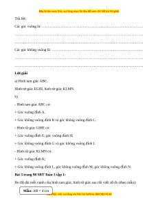 …………………………………………………………………………………………….. L i ờ giải a) Hình tam giác ABC. Hình t gi ứ ác EGHI, hình t gi ứ ác KLMN. b) - Hình tam giác ABC có: + Góc vuông đ nh ỉ A. + Góc không vuông đ nh B ỉ