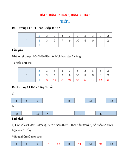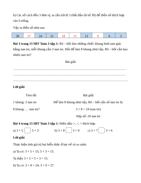 Bài 2 trang 13 Toán 3 t p 1: ậ Số? a) 3 6 9 18 24 30 b) 30 24 21 12 6 3 L i ờ giải