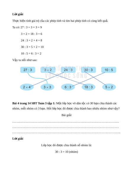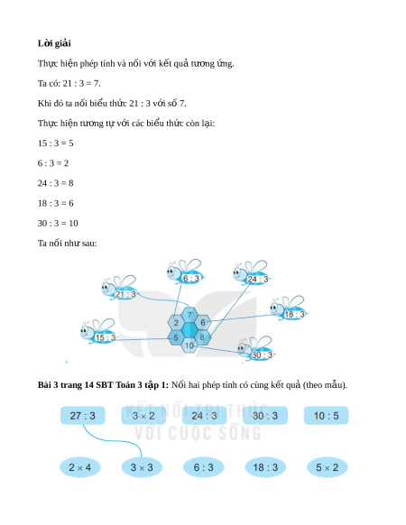 Bài 2 trang 14 SBT Toán 3 t p 1. ậ Nối (theo mẫu) L i ờ giải Th c hi ự n phép t ệ ính và n i ố v i ớ k t ế qu t ả ư ng ơ ng. ứ Ta có: 21 : 3 = 7. Khi đó ta nối bi u t ể h c 21 : ứ 3 v i ớ số 7. Th c hi ự n t ệ ư ng t ơ v ự i ớ các bi u t ể h c còn l ứ i ạ : 15 : 3 = 5 6 : 3 = 2 24 : 3 = 8 18 : 3 = 6 30 : 3 = 10 Ta nối nh s ư au: