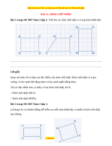 …………………………………………………………………………………………….. L i ờ giải Quan sát hình v và d ẽ a vào ự đăc đi m ể c a hì ủ nh chữ nh t ậ : Hình ch nh ữ t ậ có 4 góc vuông, có hai c nh dài ạ b ng ằ nhau và hai c nh ạ ng n b ắ ng ằ nhau. T các đ ừ ặc đi m ể trên, ta th y có hai ấ hình ch nh ữ t ậ , đó là: + Hình chữ nh t ậ ABCD. + Hình chữ nh t ậ MNPQ.