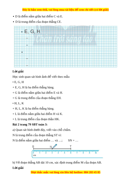 ệ đ ể xem chi ti t ế (có l i ờ gi i) ả ∙ D là đi m ể n m ằ gi a ữ hai đi m ể C và E. ∙ D là trung đi m ể c a đo ủ n ạ th ng C ẳ E. L i ờ giải H c ọ sinh quan sát hình nh đ ả ể vi t ế theo m u ẫ • E, G, H + E, G, H là ba đi m ể th ng ẳ hàng. + G là đi m ể n m ằ gi a hai ữ đi m ể E và H. + G là trung đi m ể c a đo ủ n ạ th ng E ẳ H. • H, L, K + H, L, K là ba đi m ể th ng ẳ hàng. + L là đi m ể n m ằ gi a hai ữ đi m ể H và K. + L là trung đi m ể c a ủ đo n t ạ h n ằ HK.