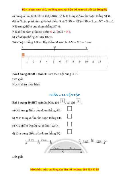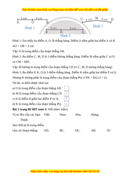 ệ đ ể xem chi ti t ế (có l i ờ gi i) ả Hình 1: Em th y ba đi ấ m ể A, O, B th ng ẳ hàng. Đi m ể O n m ằ gi a ữ hai đi m ể A và B. AO = OB = 2 cm. V y ậ O là trung đi m ể c a đo ủ n ạ th ng ẳ AB. Hình 2: Ba đi m ể C, M, D là 3 đi m ể không th ng hàng. Đ ẳ i m ể M n m ằ gi a ữ C và D và CM = MD. V y ậ M không là trung đi m ể c a đo ủ n ạ th ng C ẳ D (vì C, M, D không th ng ẳ hàng) Hình 3: Ba đi m ể P, K, Q là 3 đi m ể th ng ẳ hàng. Đi m ể K n m ằ gi a ữ hai đi m ể P và Q. Nh ng ư K không ph i ả là trung đi m ể c a đo ủ n ạ th ng PQ ẳ vì PK > KQ (3 > 2). T đó, t ừ a đi n đ ề ư c ợ nh s ư au a) O là trung đi m ể c a đo ủ n ạ th ng ằ AB. đ b) M là trung đi m ể c a đo ủ n ạ th ng C ằ D. s c) K là đi m ể gi ở a ữ hai đi m ể P và Q. đ d) K là trung đi m ể c a đo ủ n ạ th ng ẳ PQ. s