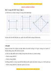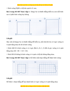 ủ hình vuông: Có 4 góc vuông và 4 c nh ạ có độ dài b ng nhau đ ằ t ể r l ả i ờ câu h i ỏ . a) T các ừ đ c đi ặ m ể trên ta th y t ấ rong hình v t ẽ rên có 2 hình vuông: + Hình vuông ABCD; + Hình vuông PQRS. b) Dùng thư c có ớ chia v ch ạ đ đo đ ể dài ộ m i ỗ c nh c ạ a ủ hình vuông, ta có k t ế qu s ả au: