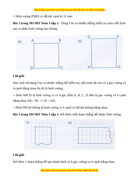 Bài 2 trang 103 SBT Toán 3 t p 1: ậ Dùng ê ke và thư c ớ th ng ki ẳ m ể tra xem m i ỗ hình sau có ph i ả hình vuông hay không. L i ờ giải H c ọ sinh sử d ng ụ ê ke và thư c ớ th ng ẳ đ ể ki m ể tra, n u