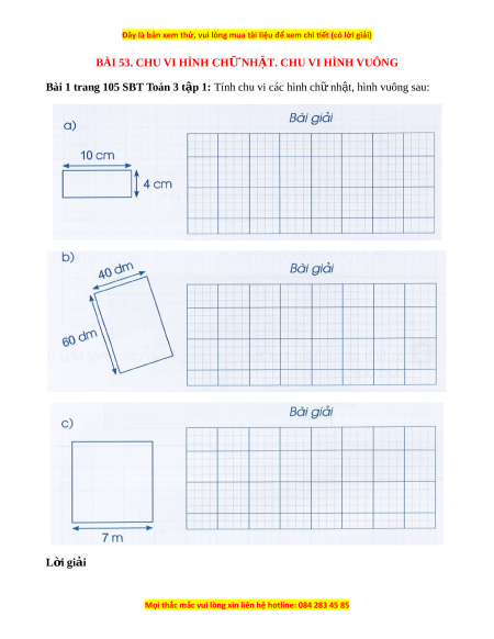 Bài 1 trang 105 SBT Toán 3 t p 1: ậ Tính chu vi các hình ch nh t, hình vuông sau:ữ ậ