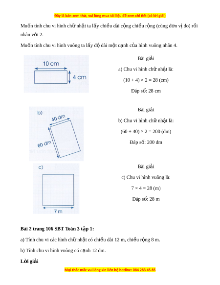 Muốn tính chu vi hình vuông ta l y đ ấ dài ộ m t ộ c nh c ạ a ủ hình vuông nhân 4. Bài gi i ả a) Chu vi hình chữ nh t ậ là: (10 + 4) × 2 = 28 (cm) Đáp số: 28 cm Bài gi i ả b) Chu vi hình ch nh ữ t ậ là: (60 + 40) × 2 = 200 (dm) Đáp số: 200 dm Bài gi i ả c) Chu vi hình vuông là: 7 × 4 = 28 (m) Đáp số: 28 m