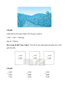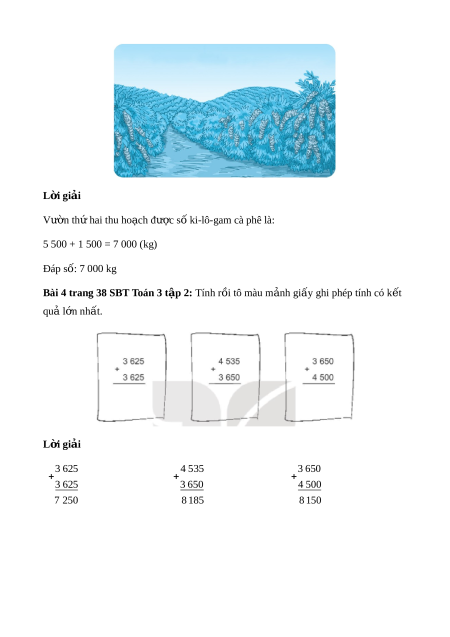 ậ 2: Nhà bác Vân có hai vư n ờ tr ng ồ cà phê. Vư n ờ thứ nhất thu ho ch ạ đư c ợ 5 500 kg cà phê. Vư n ờ th ứ hai thu ho ch ạ đư c ợ nhi u ề h n ơ vư n ờ thứ nh t ấ 1 500 kg cà phê. H i ỏ vư n ờ th ứ hai thu ho ch ạ đư c ợ bao nhiêu ki-lô- gam cà phê? L i ờ giải Vư n ờ th hai ứ thu ho ch ạ đư c s ợ ki ố -lô-gam cà phê là: 5 500 + 1 500 = 7 000 (kg) Đáp số: 7 000 kg
