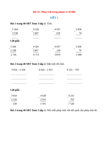 Bài 1 trang 40 SBT Toán 3 t p 2: ậ Tính. 5 264 8 320 4 037 2 658 2 538 1 607 218 70 ......... .......... ........... ........... L i ờ giải 5 264 8 320 4 037 2 658 2 538 1 607 218 70 2 726 6 713 3 819 2 588