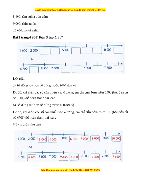 Bài 3 trang 4 SBT Toán 3 t p 2. ậ Số? L i ờ giải: a) Số đ ng s ứ au h n s ơ ố đ ng t ứ rư c 1000 đ ớ n ơ vị. Do đó, khi đi n ề các số còn thi u ế vào ô tr ng, ố em ch ỉc n ầ đ m ế thêm 1000 (b t ắ đ u ầ từ số 1000) đ hoàn t ể hành bài toán. b) Số đ ng ứ sau h n s ơ ố đ ng t ứ rư c ớ 100 đ n v ơ . ị Do đó, khi đi n ề các số còn thi u ế vào ô tr ng, ố em chỉ c n ầ đ m ế thêm 100 (b t ắ đ u ầ từ số 6700) đ hoàn t ể hành bài toán. V y ậ ta đi n nh ề s ư au: