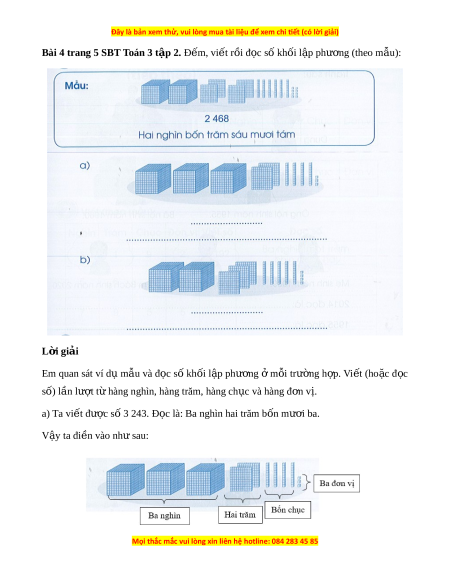 Bài 4 trang 5 SBT Toán 3 t p 2. ậ Đ m ế , vi t ế rồi đ c s ọ ố khối l p ph ậ ư ng ơ (theo m u) ẫ : L i ờ giải Em quan sát ví d ụ m u ẫ và đ c ọ s ố kh i ố l p ậ phư ng ơ ở m i ỗ trư ng ờ h p. ợ Vi t ế (ho c ặ đ c ọ số) lần lư t ợ t hàng nghì ừ n, hàng trăm, hàng ch c ụ và hàng đ n v ơ ị. a) Ta vi t ế được số 3 243. Đ c