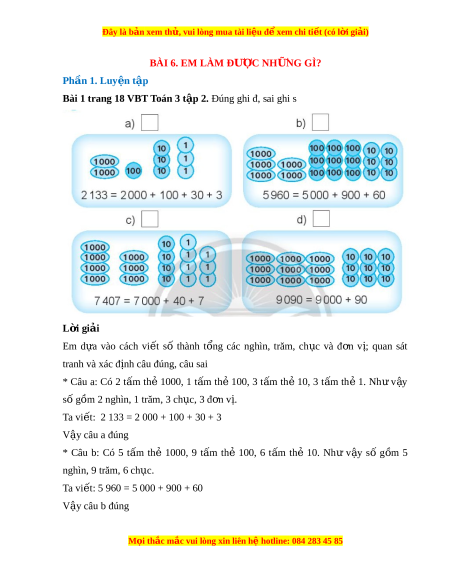 ệ đ xe ể m chi ti t (c ế ó lời gi i ả ) * Câu c: Có 7 t m ấ thẻ 1 000; 4 t m ấ thẻ 10, 7 t m ấ thẻ 1. Như v y ậ số g m ồ 7 nghìn, 4 ch c, 7 đ ụ n v ơ ị Ta vi t ế : 7 041 = 7 000 + 40 + 7 V y câu ậ c sai * Câu d: Có 9 t m ấ th 1 000; ẻ 9 t m ấ th 10. N ẻ hư v y s ậ g ố m ồ 9 nghìn, 9 ch c ụ Ta vi t ế : 9 090 = 9 000 + 90 V y câu ậ d đúng ⟶ K t ế lu n: ậ Câu đúng: a, b, d Câu sai: c