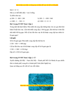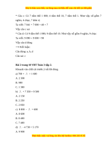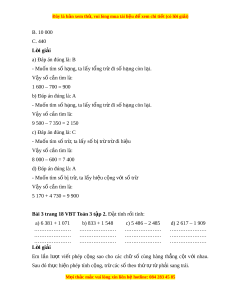 ệ đ xe ể m chi ti t (c ế ó lời gi i ả ) B. 10 000 C. 440 L i ờ giải a) Đáp án đúng là: B - Muốn tìm s h ố ng, ạ ta l y t ấ ng t ổ r đi ừ s h ố ng ạ còn l i ạ . V y s ậ ố cần tìm là: 1 600 – 700 = 900 b) Đáp án đúng là: A - Muốn tìm s h ố ng, ạ ta l y t ấ ng t ổ r đi ừ s h ố ng ạ còn l i ạ . V y s ậ ố cần tìm là: 9 500 – 7 350 = 2 150 c) Đáp án đúng là: C - Muốn tìm s t ố r , t ừ a l y s ấ b ố t ị r t ừ r đi ừ hi u ệ V y s ậ ố cần tìm là: 8 000 – 600 = 7 400 d) Đáp án đúng là: A - Muốn tìm s b ố t ị r , t ừ a l y hi ấ u c ệ ng ộ v i ớ s t ố rừ V y s ậ ố cần tìm là: 5 170 + 4 730 = 9 900