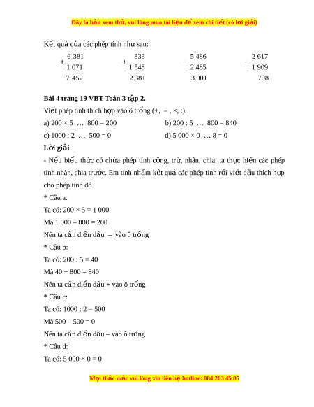 c) 1000 : 2 … 500 = 0 d) 5 000 × 0 … 8 = 0 L i ờ giải - N u ế bi u ể th c ứ có ch a ứ phép tính c ng, ộ tr , ừ nhân, chia, ta th c ự hi n ệ các phép tính nhân, chia trư c. ớ Em tính nh m ẩ k t ế qu ả các phép tính r i ồ vi t ế d u ấ thích h p ợ cho phép tính đó * Câu a: Ta có: 200 × 5 = 1 000 Mà 1 000 – 800 = 200 Nên ta cần đi n d ề ấu – vào ô trống * Câu b: Ta có: 200 : 5 = 40 Mà 40 + 800 = 840 Nên ta cần đi n d ề ấu + vào ô tr ng ố * Câu c: Ta có: 1000 : 2 = 500 Mà 500 – 500 = 0 Nên ta cần đi n d ề ấu – vào ô trống * Câu d: Ta có: 5 000 × 0 = 0 M i