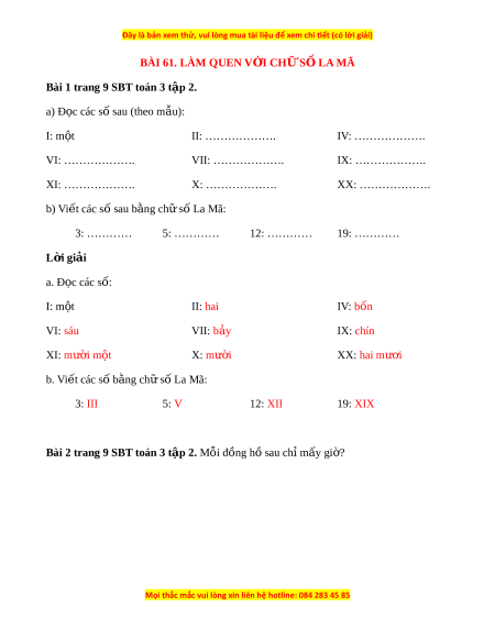 Bài 1 trang 9 SBT toán 3 t p 2 ậ . a) Đ c các ọ số sau (theo m u) ẫ : I: m t ộ II: ………………. IV: ………………. VI: ………………. VII: ………………. IX: ………………. XI: ………………. X: ………………. XX: ………………. b) Vi t ế các số sau b ng ằ ch s ữ ố La Mã: 3: ………… 5: ………… 12: ………… 19: ………… L i ờ giải a. Đ c ọ các số: I: m t ộ II: hai IV: bốn VI: sáu VII: b y ả IX: chín XI: mư i ờ m t ộ X: mư i ờ XX: hai mư i ơ b. Vi t ế các số b ng ằ ch s ữ ố La Mã: 3: III 5: V 12: XII 19: XIX