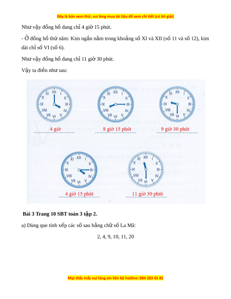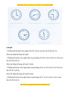 L i ờ giải - Ở đồng hồ th nh ứ t ấ : Kim ng n ch ắ s ỉ I ố V (s 4) ố , kim dài ch s ỉ ố XII (s 12 ố ). Như v y đ ậ ồng hồ đang ch 4 gi ỉ ờ. - Ở đồng hồ th hai ứ , kim ng n n ắ m ằ trong kho ng ả s ố VIII và s I ố X (s 8 và s ố 9) ố , kim dài chỉ số III (s 3) ố . Như v y đ ậ ồng hồ đang ch 8 gi ỉ ờ 15 phút. - Ở đồng hồ th ba: ứ Kim ng n ắ n m ằ trong kho ng ả s I ố X và s X ố (s 9 và s ố 10) ố , kim dài chỉ số VI (số 6). Như v y đ ậ ồng hồ đang ch 9 gi ỉ ờ 30 phút. - Ở đồng hồ th t ứ : ư Kim ng n n ắ m ằ trong kho ng ả s I ố V và số V (s 4 và ố s v ố ), kim dài chỉ số III (s 3) ố .