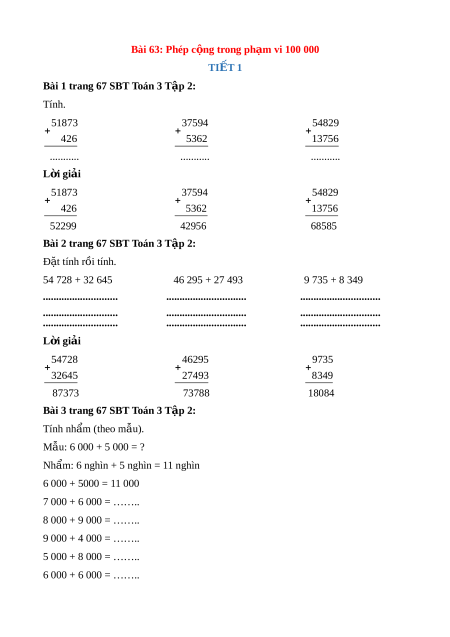 Bài 1 trang 67 SBT Toán 3 T p 2 ậ : Tính. 51873 37594 54829 426 5362 13756 ........... ........... ........... L i ờ giải 51873 37594 54829 426 5362 13756 52299 42956 68585