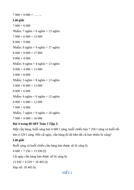 Buổi sáng và buổi chi u c ề a hàng ử bán đư c s ợ ố lít xăng là: 6 680 + 7 256 = 13 936 (l) C ngày c ả a ử hàng bán đư c ợ s l ố ít xăng là: 13 936 + 4 529 = 18 465 (l) Đáp số: 18 465 lít. TIẾT 2