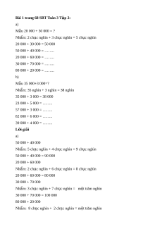 Bài 1 trang 68 SBT Toán 3 T p 2 ậ : a) Mẫu 20 000 + 30 000 = ? Nhẩm: 2 ch c nghì ụ n + 3 ch c ụ nghìn = 5 ch c nghì ụ n 20 000 + 30 000 = 50 000 50 000 + 40 000 = …….. 20 000 + 60 000 = …….. 30 000 + 70 000 = …….. 80 000 + 20 000 = …….. b) Mẫu 35 000+3 000=?