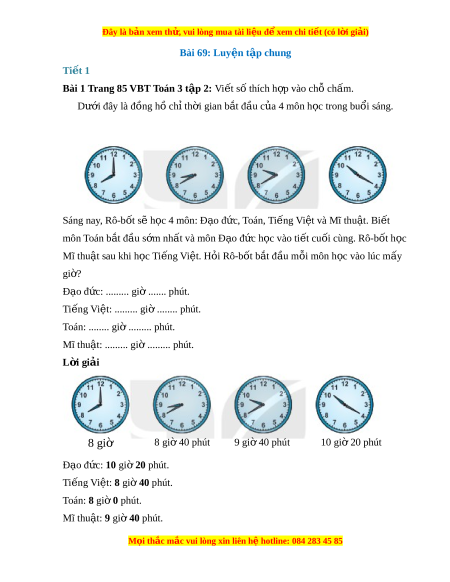 ớ đây là đồng hồ ch t ỉ h i ờ gian b t ắ đ u c ầ a ủ 4 môn h c ọ trong bu i ổ sáng. Sáng nay, Rô-b t ố sẽ h c 4 m ọ ôn: Đ o ạ đ c, ứ Toán, Ti ng ế Vi t ệ và Mĩ thu t ậ . Bi t ế môn Toán b t ắ đầu s m ớ nhất và môn Đ o đ ạ c ứ h c vào t ọ i t ế cu i ố cùng. Rô-b t ố h c ọ Mĩ thu t ậ sau khi h c ọ Ti ng ế Vi t ệ . H i ỏ Rô-b t ố b t ắ đ u m ầ i ỗ môn h c vào ọ lúc m y ấ gi ? ờ Đ o đ ạ c: ứ ......... gi ....... phút ờ . Ti ng ế Vi t