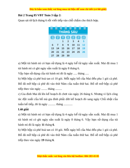 Bài 2 Trang 85 VBT Toán 3 t p 2: ậ Quan sát t l ờ ịch tháng 6 rồi vi t ế ti p vào ch ế ỗ ch m ấ cho thích h p. ợ a) M t ộ túi bánh mì có h n ạ sử d ng ụ là 4 ngày k ể t ừ ngày s n ả xu t ấ . Mai đã mua 1
