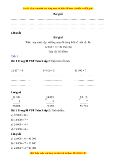 Bài 1 Trang 91 VBT Toán 3 tập 2: Đ t ặ tính r i ồ tính. 12 107 × 8 14 019 × 5 13 109 × 7 ………………… ………………… ………………… ………………… ………………… ………………… ………………… ………………… ………………… L i ờ giải 12 107 14 019 13 109 8 5 7 96 856 70 095 91 763