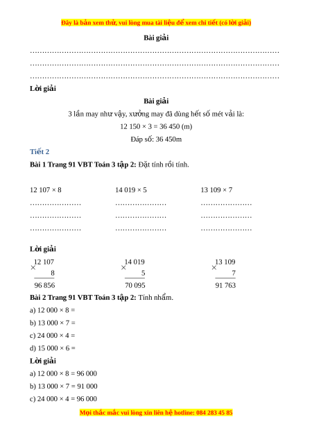 ………………………………………………………………………………………… L i ờ giải Bài giải 3 lần may nh v ư y ậ , xư ng m ở ay đã dùng h t ế số mét v i ả là: 12 150 × 3 = 36 450 (m) Đáp số: 36 450m Ti t ế 2