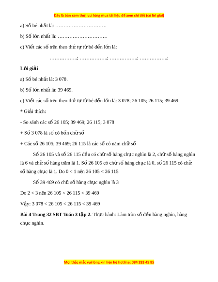 ……………..; ……………..; ……………..; ……………..; L i ờ giải a) Số bé nhất là: 3 078. b) Số l n ớ nh t ấ là: 39 469. c) Vi t ế các số trên theo th t ứ t ự bé đ ừ n l ế n l