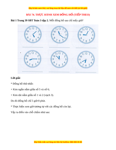 Do đó đồng hồ chỉ 5 gi 8 phút ờ . * Th c ự hiện xem giờ tư ng t ơ v ự i ớ các đ ng h ồ còn l ồ i ạ . V y ậ ta đi n vào ch ề ỗ ch m ấ nh s ư au: