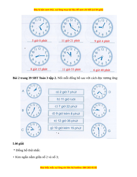 Bài 2 trang 39 SBT Toán 3 t p 2. ậ Nối m i ỗ đồng hồ sau v i ớ cách đ c ọ tư ng ơ ng: ứ L i ờ giải * Đồng hồ th nh ứ t ấ : + Kim ng n ắ n m ằ gi a s ữ 2 và ố s 3; ố