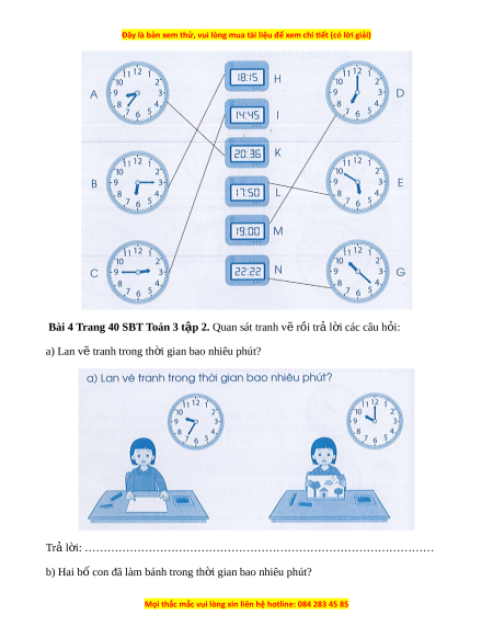 Bài 3 trang 40 SBT Toán 3 t p 2. ậ N i hai đ ng h ch cùng th i gian vào bu i chi u ố ồ ồ ỉ ờ ổ ề