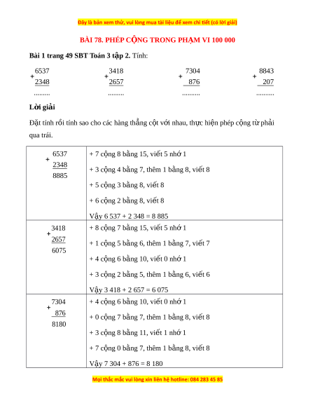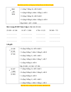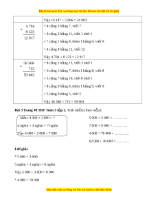 ặ tính rồi tính sao cho các hàng th ng ẳ c t ộ v i ớ nhau, th c hi ự n phép c ệ ng ộ t ph ừ i ả qua trái. 6537 + 7 c ng 8 b ộ ng ằ 15, vi t ế 5 nh 1 ớ 2348 + 3 c ng 4 b ộ ng ằ 7, thêm 1 b ng 8, vi ằ t ế 8 8885 + 5 c ng 3 b ộ ng ằ 8, vi t ế 8 + 6 c ng 2 b ộ ng ằ 8, vi t ế 8 V y 6 537 + 2 348 = 8 885 ậ 3418 + 8 c ng 7 b ộ ng ằ 15, vi t ế 5 nh 1 ớ 2657 + 1 c ng 5 b ộ ng ằ 6, thêm 1 b ng 7, vi ằ t ế 7 6075 + 4 c ng 6 b ộ ng ằ 10, vi t ế 0 nh 1 ớ + 3 c ng 2 b ộ ng ằ 5, thêm 1 b ng 6, vi ằ t ế 6 V y 3 418 + 2 657 = 6 075 ậ 7304 + 4 c ng 6 b ộ ng ằ 10, vi t ế 0 nh 1 ớ 876 + 0 c ng 7 b ộ ng ằ 7, thêm 1 b ng 8, vi ằ t ế 8 8180 + 3 c ng 8 b ộ ng ằ 11, vi t ế 1 nhớ 1 + 7 c ng 0 b ộ ng ằ 7, thêm 1 b ng 8, vi ằ t ế 8 V y 7 304 + 876 = 8 180 ậ