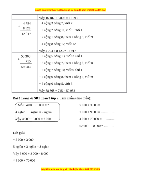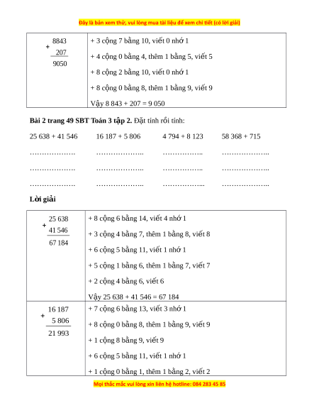 Bài 2 trang 49 SBT Toán 3 t p 2. ậ Đ t ặ tính rồi tính: 25 638 + 41 546 16 187 + 5 806 4 794 + 8 123 58 368 + 715 ………………. ……………….. …………….. ……………….. ………………. ……………….. …………….. ……………….. ………………. ……………….. ……………... ……………….. L i ờ giải 25 638 + 8 c ng 6 b ộ ng ằ 14, vi t ế 4 nh 1 ớ 41 546 + 3 c ng 4 b ộ ng ằ 7, thêm 1 b ng 8, vi ằ t ế 8 67 184 + 6 c ng 5 b ộ ng ằ 11, vi t ế 1 nhớ 1 + 5 c ng 1 b ộ ng ằ 6, thêm 1 b ng 7, vi ằ t ế 7 + 2 c ng 4 b ộ ng ằ 6, vi t ế 6 V y 25 638 + 41 546 = 67 184 ậ 16 187 + 7 c ng 6 b ộ ng ằ 13, vi t ế 3 nh 1 ớ 5 806 + 8 c ng 0 b ộ ng ằ 8, thêm 1 b ng 9, vi ằ t ế 9 21 993 + 1 c ng 8 b ộ ng ằ 9, vi t ế 9 + 6 c ng 5 b ộ ng ằ 11, vi t ế 1 nhớ 1 + 1 c ng 0 b ộ ng ằ 1, thêm 1 b ng 2, vi ằ t ế 2