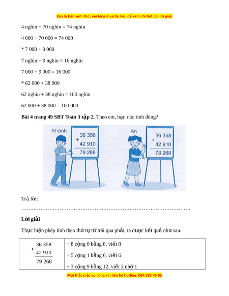……………………………………………………………………………………. L i ờ giải Th c hi ự n phép t ệ ính theo th t ứ t ự t ừ rái qua ph i ả , ta đư c k ợ t ế qu nh ả s ư au: 36 358 + 8 c ng ộ 0 b ng 8, vi ằ t ế 8 42 910 + 5 c ng ộ 1 b ng 6, vi ằ t ế 6 79 268 + 3 c ng ộ 9 b ng 12, vi ằ t ế 2 nh 1 ớ