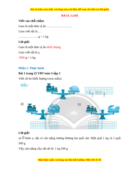 ệ đ xe ể m chi ti t (c ế ó lời gi i ả ) BÀI 8. GAM Vi t ế vào chỗ chấm Gam là m t ộ đ n v ơ đo ……………………. ị Gam vi t ế t t ắ là … ………………. g = 1 kg L i ờ giải Gam là m t ộ đ n v ơ đo ị khối lư ng ợ Gam vi t ế t t ắ là g 1000 g = 1 kg Phần 1. Th c hành ự