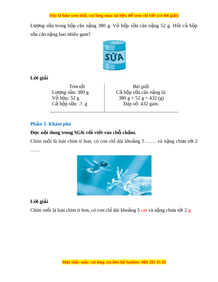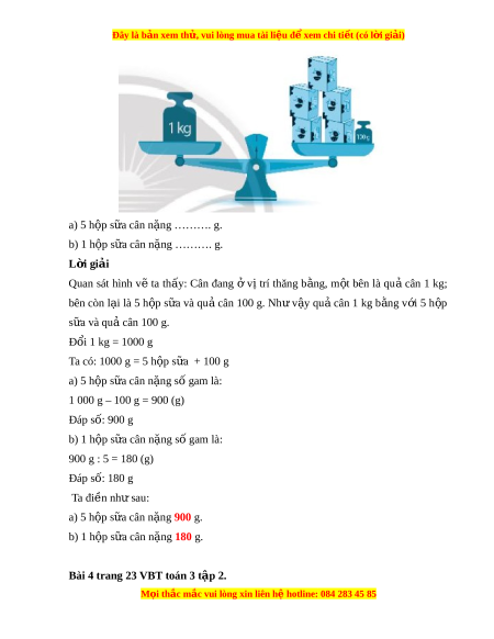 ệ đ xe ể m chi ti t (c ế ó lời gi i ả ) a) 5 h p s ộ a ữ cân n ng ………. g. ặ b) 1 h p ộ s a cân ữ n ng ………. g. ặ L i ờ giải Quan sát hình vẽ ta th y: ấ Cân đang ở vị trí thăng b ng, ằ m t ộ bên là qu ả cân 1 kg; bên còn l i ạ là 5 h p ộ s a ữ và qu ả cân 100 g. Nh ư v y ậ qu ả cân 1 kg b ng ằ v i ớ 5 h p ộ s a ữ và qu cân ả 100 g. Đ i ổ 1 kg = 1000 g Ta có: 1000 g = 5 h p s ộ a ữ + 100 g a) 5 h p s ộ a ữ cân n ng s ặ ố gam là: 1 000 g – 100 g = 900 (g) Đáp số: 900 g b) 1 h p ộ s a cân ữ n ng s ặ gam ố là: 900 g : 5 = 180 (g) Đáp số: 180 g Ta đi n nh ề s ư au: a) 5 h p s ộ a ữ cân n ng ặ 900 g. b) 1 h p ộ s a cân ữ n ng ặ 180 g.