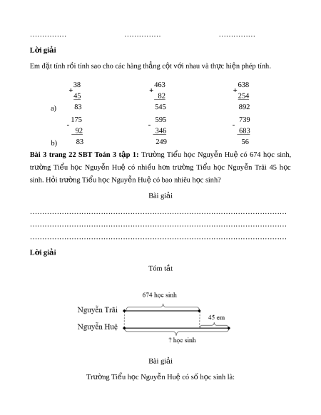 Bài 3 trang 22 SBT Toán 3 t p ậ 1: Trư ng ờ Ti u ể h c ọ Nguy n ễ Huệ có 674 h c ọ sinh, trư ng ờ Ti u ể h c ọ Nguy n ễ Huệ có nhi u ề h n ơ trư ng ờ Ti u ể h c ọ Nguy n ễ Trãi 45 h c ọ sinh. H i ỏ trư ng ờ Ti u h ể c N ọ guy n ễ Hu có bao nhi ệ êu h c s ọ inh? Bài gi i ả
