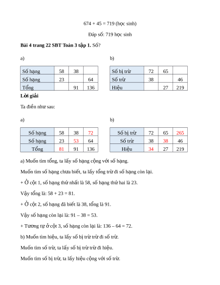 Bài 4 trang 22 SBT Toán 3 t p 1. ậ Số? a) b) Số h ng ạ 58 38 Số bị trừ 72 65 Số h ng ạ 23 64 Số trừ 38 46 T ng ổ 91 136 Hi u ệ 27 219 L i ờ giải Ta đi n nh ề s ư au: a) b) Số h ng ạ 58 38 72 Số bị trừ 72 65 265 Số h ng ạ 23 53 64 Số trừ 38 38 46 Tổng 81 91 136 Hi u ệ 34 27 219 a) Muốn tìm t ng, t ổ a l y s ấ h ố ng ạ c ng v ộ i ớ s h ố ng ạ . Muốn tìm số h ng ạ ch a bi ư t ế , ta l y t ấ ng t ổ r đi ừ s h ố ng ạ còn l i ạ . + c Ở t ộ 1, số h ng ạ th nh ứ t ấ là 58, s h ố ng t ạ hứ hai là 23. V y ậ tổng là: 58 + 23 = 81. + c Ở t ộ 2, số h ng ạ đã bi t ế là 38, t ng l ổ à 91. V y ậ số h ng ạ còn l i ạ là: 91 – 38 = 53. + Tư ng ơ t ự c ở t ộ 3, s h ố ng ạ còn l i ạ là: 136 – 64 = 72. b) Muốn tìm hi u, t ệ a l y s ấ b ố t ị r t ừ rừ đi số trừ. Muốn tìm số tr , t ừ a l y s ấ b ố t ị r t ừ r đi ừ hi u ệ . Muốn tìm số b t ị r , t ừ a l y h ấ i u c ệ ng ộ v i ớ s t ố rừ.